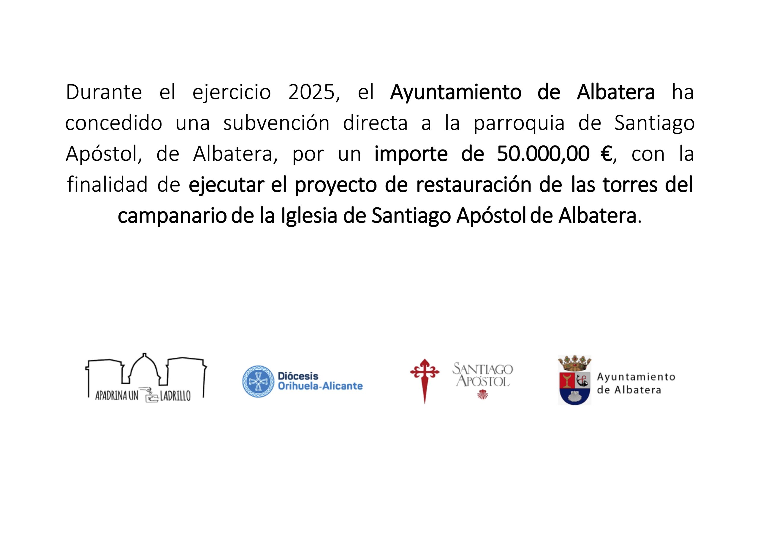 Nos complace anunciar que, durante el ejercicio 2024, el Ayuntamiento de Albatera ha concedido una subvención directa de 50.000,00 € a la Parroquia de Santiago Apóstol. Este apoyo tiene como finalidad llevar a cabo el proyecto de restauración de las torres del campanario de la emblemática Iglesia de Santiago Apóstol, un símbolo de nuestra historia y cultura.